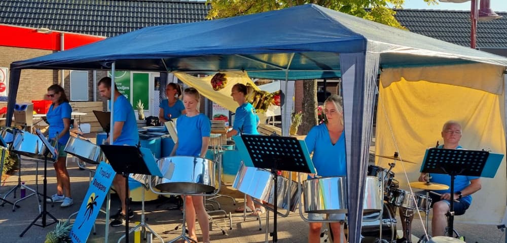 Eindelijk weer een pleinfeest en hoe… Iedereen had er weer zin in. Vrolijk werd je al van de kleurig uitgedoste vrijwilligers en de klanken van de Tropical Steelpans. Het thema Tropical was vervolgens terug te vinden in het blauwe of groene welkomstdrankje en het diner met de gele kerriesoep, paella vis of kip en tropisch fruit toe.