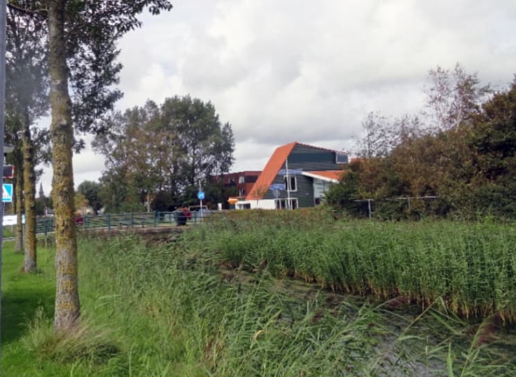 Het riet langs de egalement staat hoog, maar goed ook want dit zo mooie water is goeddeels dichtgegroeid. Een mooi zichtbaar water zou alles veel vrolijker maken en dan viel die school waarschijnlijk ook niet zo op. Vanaf deze kant dus een slordige binnenkomer.