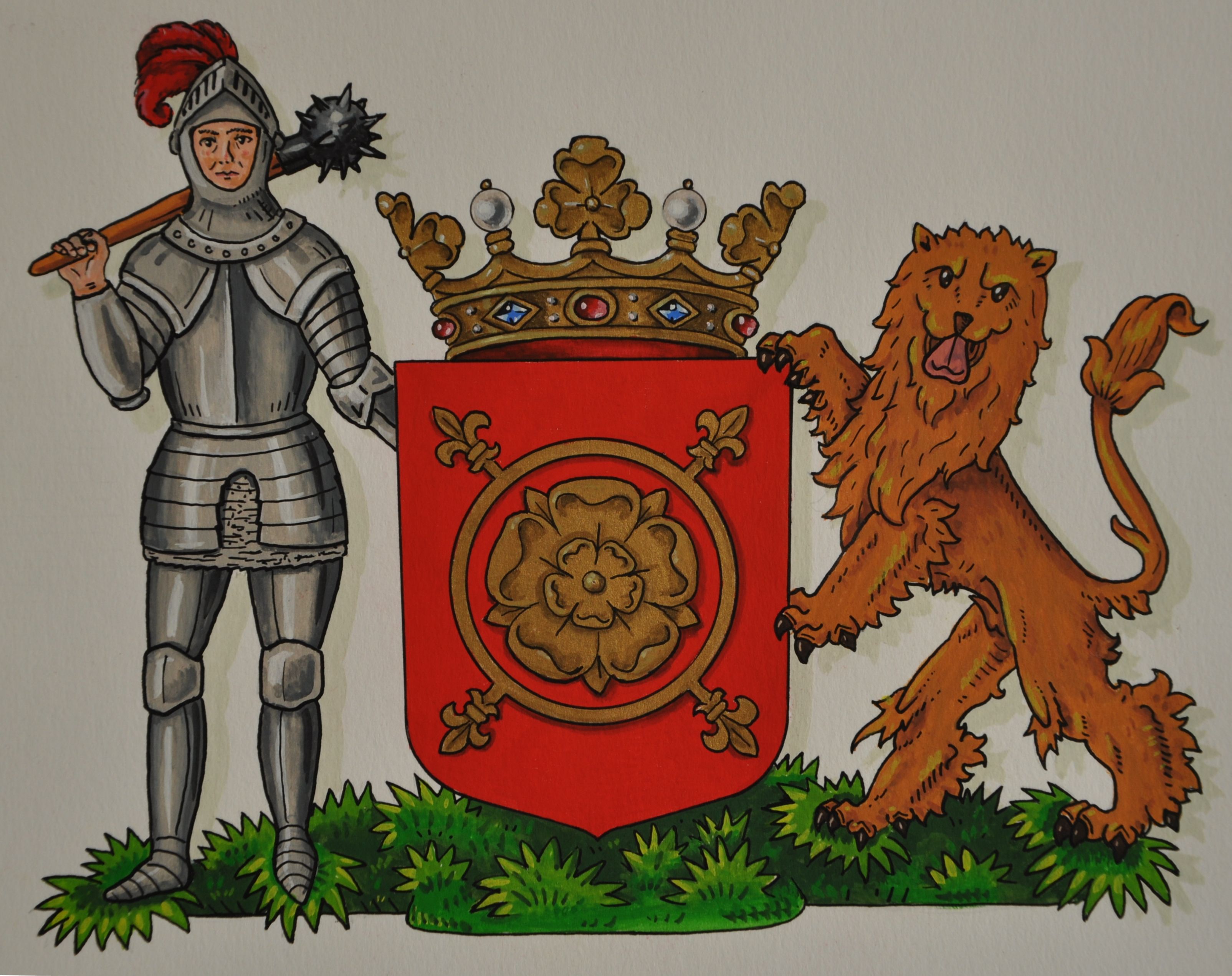 “In keel een roos liggende in een ring waarop vier diagonaal geplaatste geleliede stokjes, alles van goud. Het schild gedekt met een gouden kroon van drie bladeren en twee parels en gehouden rechts door een geharnaste man, een rode pluim op zijn helm en houdende over de rechterschouder een morgenster, en links door een aanziende leeuw, staande op een grasgrond alles van natuurlijke kleur”.