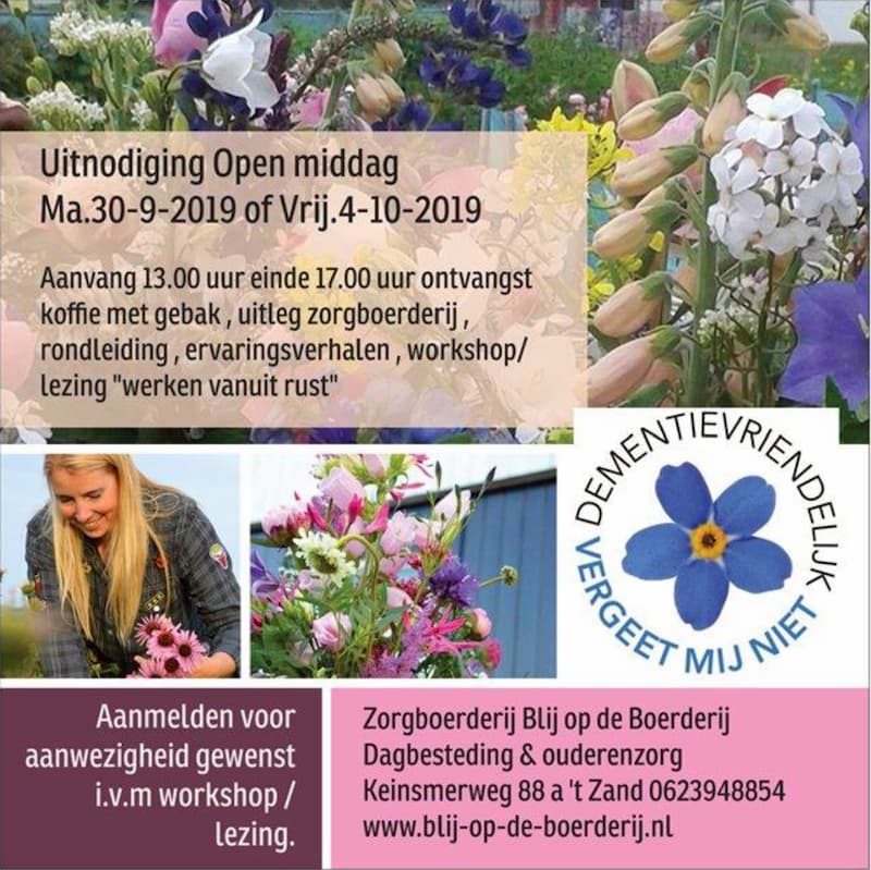 Op 4 oktober is er een open dag op Zorgboerdrij – Blij op de Boerderij. Deze dag is specifiek bedoelt voor begeleiders, verzorgers, mantelzorgers en casemanagers in de zorg. Maar ook voor mensen met een zorgvraag die een gewenste dagbesteding plek zoeken. En uiteraard ieder ander die wil zien wat het werk op de boerderijwerk inhoud.