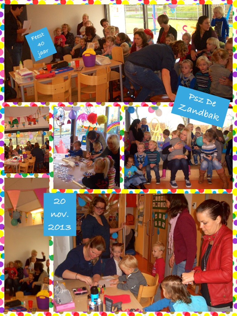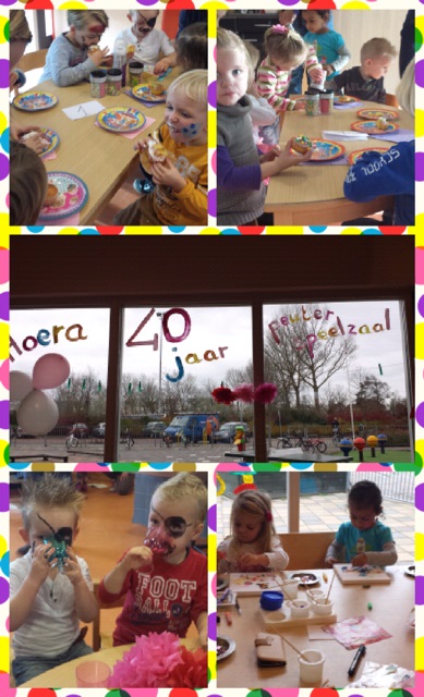 Peuterspeelzaal De Zandbak heeft vorige week woensdag haar veertig jarig jubileum gevierd. Dit jubileum werd ’s morgens gevierd met vele leuke activiteiten. De peuters konden heerlijk spelen, knutselen, film kijken en worden geschminkt. Juf Marian Kneppers heeft onderstaande fotocollage’s gemaakt van de feestelijke ochtend.