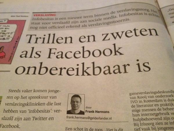 Ik begon zelfs het irritante gebrom van de koelkast te missen. En wat moest ik doen, geen vaatwasser, wasmachine, computer, internet niets! Maar dan geef je je er aan over. En verdorie, altijd is er wel weer een was te vinden die opgevouwen moest worden. En eigenlijk zou ik nu kunnen beginnen met het inplakken van al die foto’s. Maar soms ook kon je niets anders dan je totaal overgeven door te luisteren naar de oorverdovende stilte en te kijken naar de natuur. MOEILIJK…….voor mij. Maar ik deed het en het lukte. Ik deed niets en kwam intens tot rust. Dacht na over “dingen”. Wat voor dingen? Pffff kleine dingen (hoeveel melk staat er nog in de koelkast, wat moet ik nu met al die overgebleven verschillende enkele sokken, waarom krijg ik altijd de hik als ik wortels eet) grote dingen( scholing, werk, solliciteren noem maar op, toekomstplannen, besef van situaties). Het was heerlijk. Geen tv, geen internet dus geen Facebook. Iets waar ik tot mijn eigen afschuw tegenwoordig weer teveel nutteloos door heen surf. Kijkend naar berichten over vermiste personen. Berichten welke zo oud bleken te zijn dat deze vermiste personen inmiddels alweer 5 jaar thuis op de bank zaten. Condoleance registers open gesteld voor de overleden cavia. En de ‘kijk mij eens intens geluk zijn met mijn oh-het-kost-zoveel-moeite-maar-het-moet-toch-opvallen-bij-mijn-ex in elkaar gekleide glimlach’ berichten. Ik relax, mijmer en overdenk en opeens schrik ik op van de koelkast die aanslaat en meteen irritant begint te brommen. Alles doet het weer, de magnetron piept, de vaatwasser doet zijn werk verder. En ik, ik kijk op Facebook of ik iets gemist heb. Bah, wat een slechte gewoonte heb ik ontwikkeld. Natuurlijk heb ik niets gemist behalve spreuken over dat je je hart niet moet laten breken (was ik niet van plan). Welk wijnglas is als eerste vol? (maakt mij niet uit zolang het de mijne maar is). En uitslagen waarin staat dat mensen met een bepaalde letter in hun naam in dit jaar een zesling krijgen, een bbq moeten organiseren of opnieuw gaan trouwen (dat maak ik zelf wel uit). Ik ‘sprak’ laatst familie en vrienden over de app. Ze hadden zoveel ellende gehad met internet dat ze niet konden appen , berichten of over internet konden surfen, verschrikkelijk gewoon. Geen internet dus niet surfen, ik dacht aan dat mooie handige facebook waarmee ik op de hoogte blijf van diverse winkelaanbiedingen, evenementen, school, sport en belangrijke of interessante mensen. Maar ook aan de irritatie die ik ondervind door de, naar mijn mening , meest nutteloos gedeelde mededelingen, quizzen, spreuken en enquêtes waar ik teveel tijd aan besteed om zo snel mogelijk langs heen te scrollen. Dus antwoorde ik terug: heerlijk toch die rust, geniet er volgende keer lekker van………………
