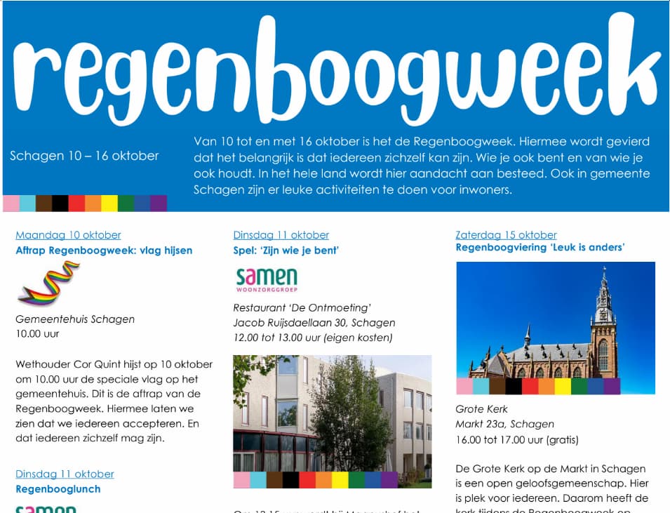Van 10 tot en met 16 oktober wordt voor de tweede keer de Regenboogweek in Schagen gevierd. Hiermee vraagt de gemeente aandacht voor seksuele en genderdiversiteit. Wethouder Cor Quint: ”De gemeente vindt het belangrijk dat iedereen in Schagen veilig en zichtbaar zichzelf kan zijn. En dat je de vrijheid hebt om te houden van wie je wilt.” In het hele land wordt hier aandacht aan besteed. Ook in gemeente Schagen zijn er leuke activiteiten te doen voor inwoners.