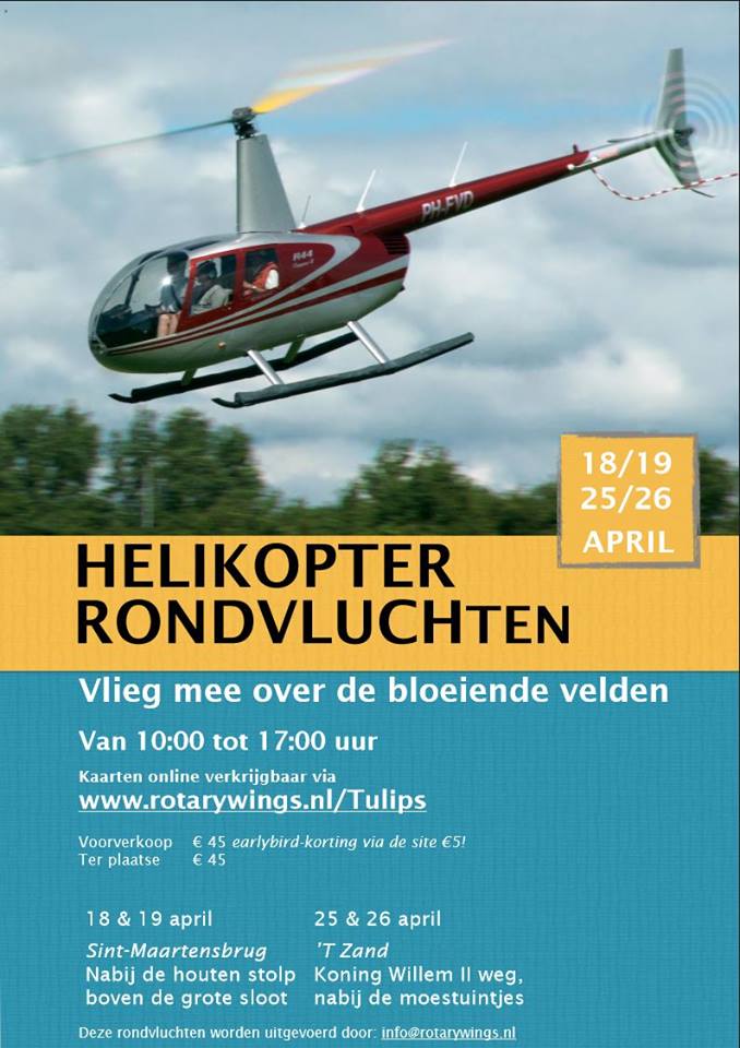Rotary Wings houdt op zaterdag 25 en zondag 26 april rondvluchten vanaf ’t Zand. Je vliegt onder meer over de bloeiende bloembollenvelden.