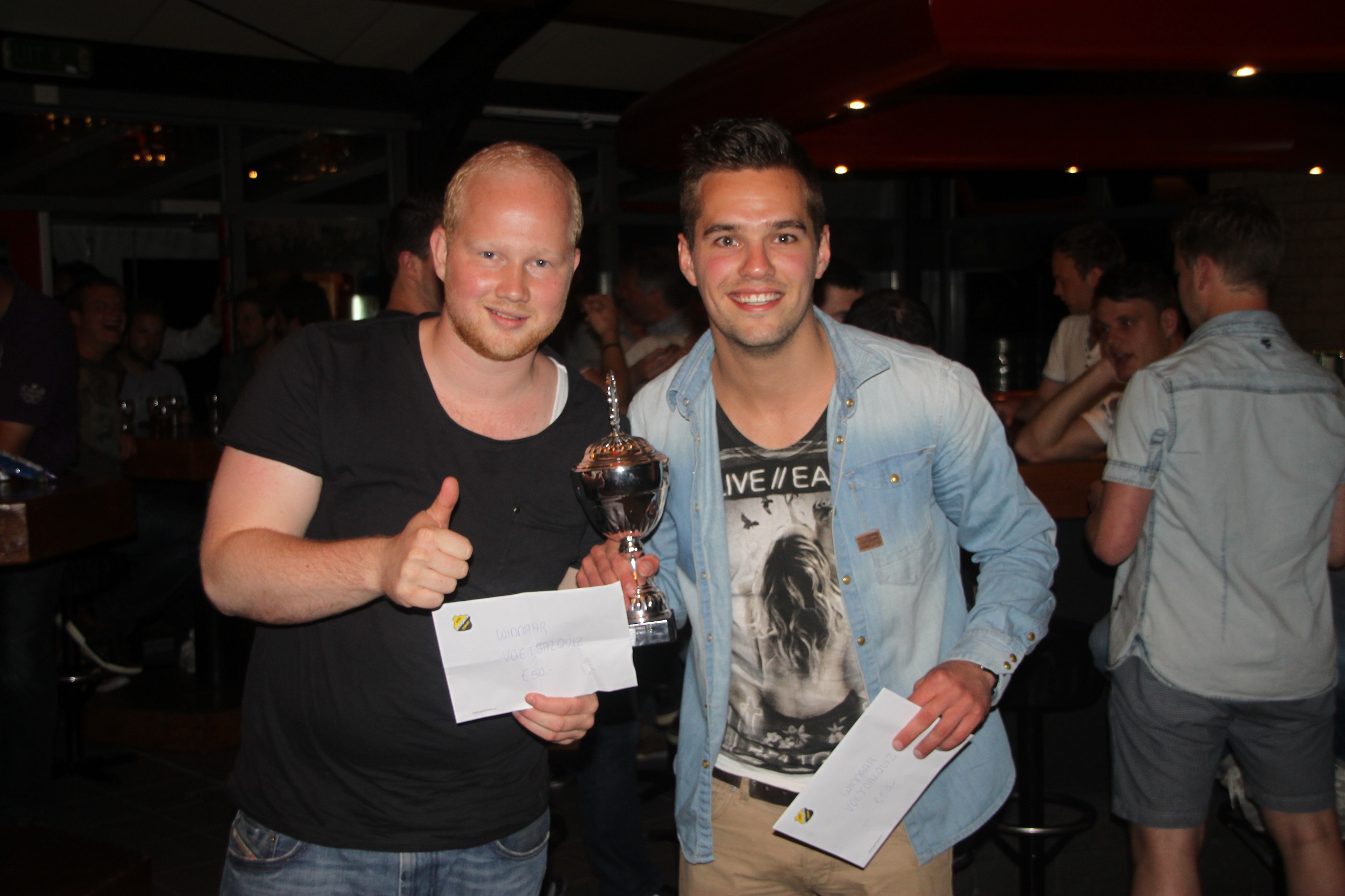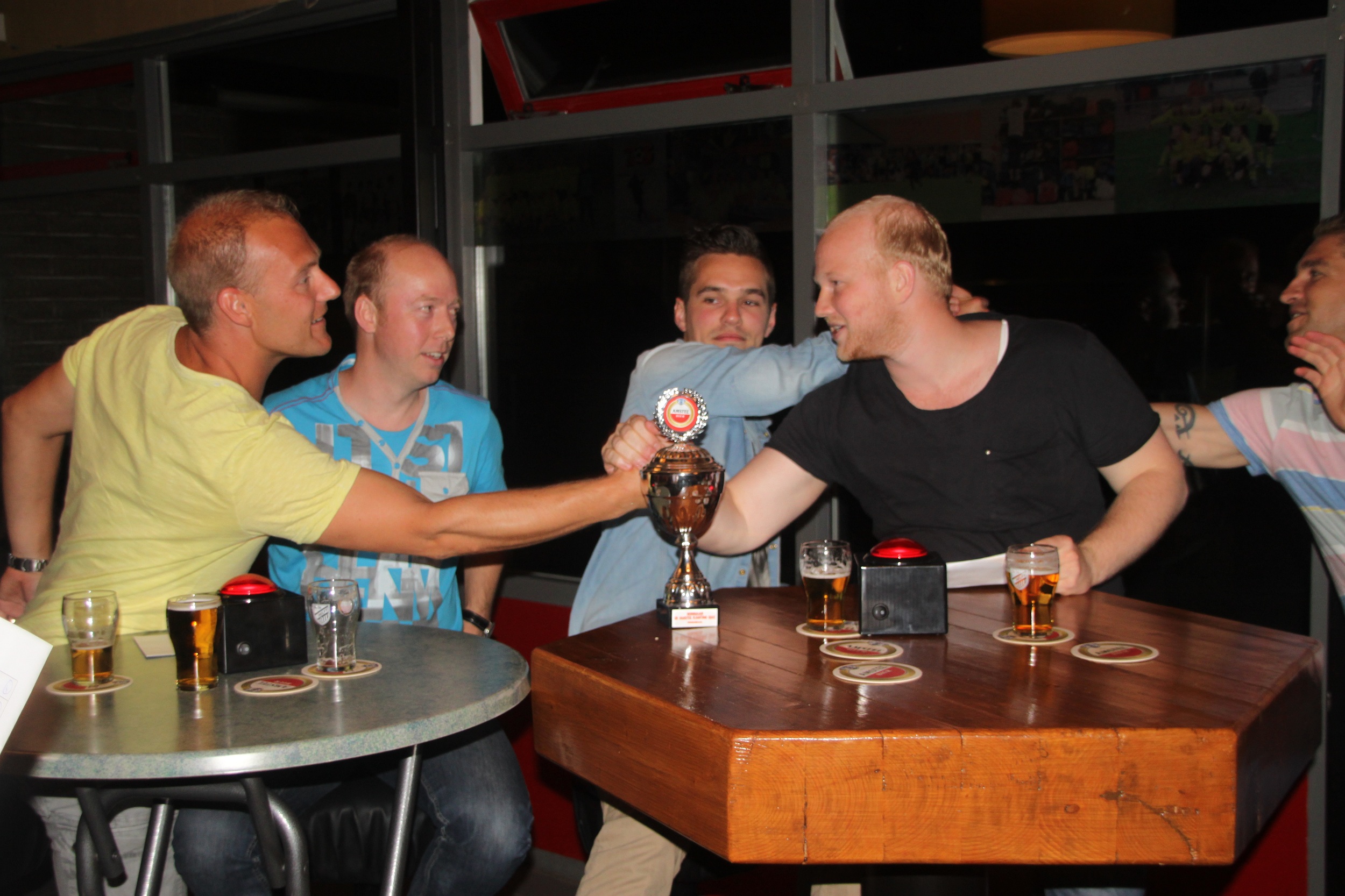 In de finale had Swansea FC zijn kruid blijkbaar verschoten. Met een bedenkelijk aantal van min negen punten eindigden zij als vierde en zo was duidelijk dat de voetbalquiz een nieuwe winnaar mocht begroeten. Met een vers getapt biertje van het tapteam ging de strijd tussen twee ploegen: Laten wet haar proberen en Ibracadabra. De vierde finalist – BP – eindigde met vier punten als derde. Zij wisten knap te noemen wie bij Atletico Madrid met rugnummer negen op het shirt speelt (David Villa). De finale was tot en met de laatste vraag spannend. Govert-Jan Jongejan en Joris de Haan wisten netjes de drie tegenstanders van PSV in de poulefase van de Europa League te benoemen (Ludogorets, Tsjornomorets Odesa en Dinamo Zagreb). De winst ging uiteindelijk naar Ibracadabra met een verschil van slechts drie punten. Met goede antwoorden op vragen als welke Nederlander is topscorer op WK eindronden met zeven doelpunten (Johnny Rep) en bij welke 2 Engelse Premier League clubs doelman Ed de Goey onder contract heeft gestaan (Chelsea en Stoke City) waren zij de terechte winnaar. Zij namen de wisselbeker in ontvangst en een geldbedrag van honderd euro. De nummers twee ontvingen twee wedstrijdkaarten voor een thuiswedstrijd van FC Volendam. Nummer drie BP kreeg het grote ‘Mens Erger Je Wel’ voetbalspel en de nummer vier ging naar huis met een Oranje brulshirt. De voetbalquiz wordt volgend jaar wederom georganiseerd.