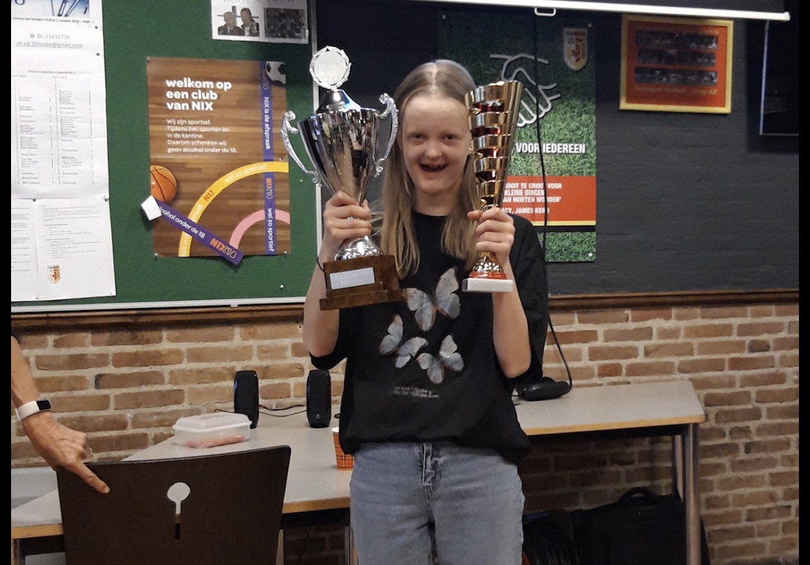 Romy: Vrijdag 22 april heb ik de progressiebokaal gewonnen bij de afsluiting van het schaatsseizoen, hierbij gaat het er vooral om hoeveel seconden je van je pr’s (persoonlijke records) hebt…