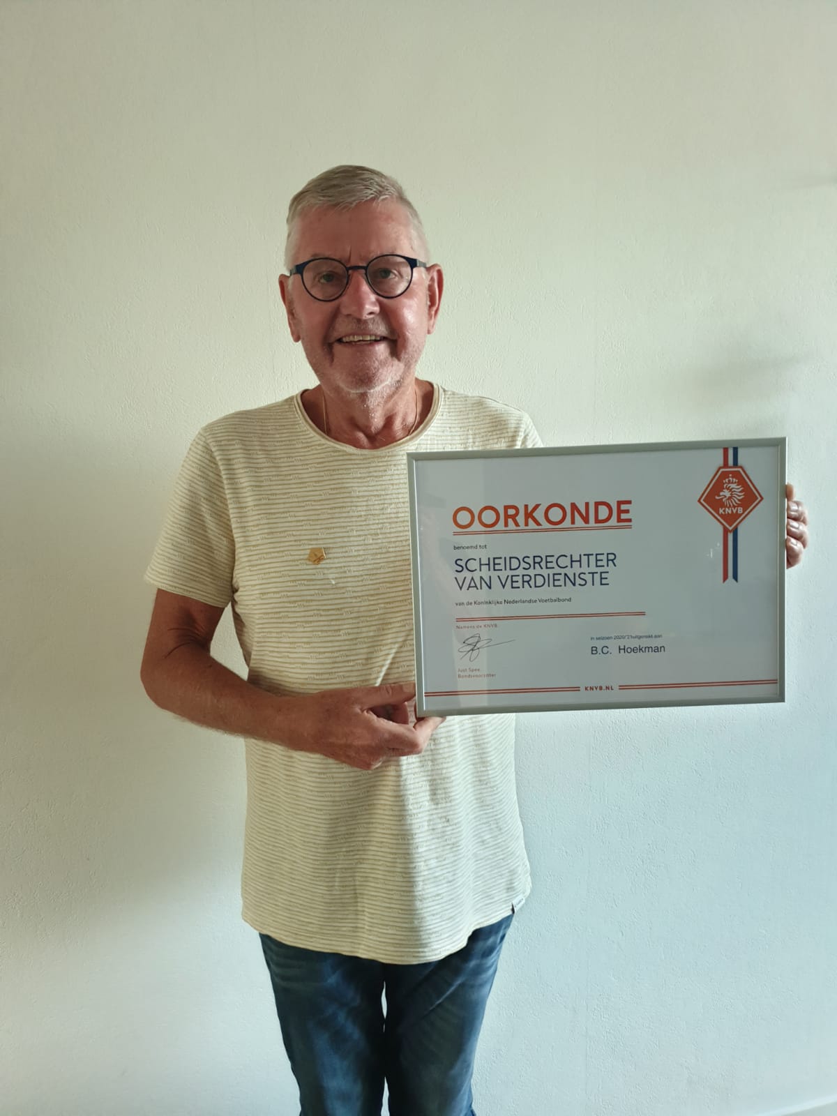 7 juli is Bart Hoekman door de KNVB onderscheiden tot “Scheidsrechter van Verdienste”. In verband met de coronamaatregelen is de uitreiking van de bijbehorende oorkonde bij Bart thuis uitgereikt door…