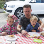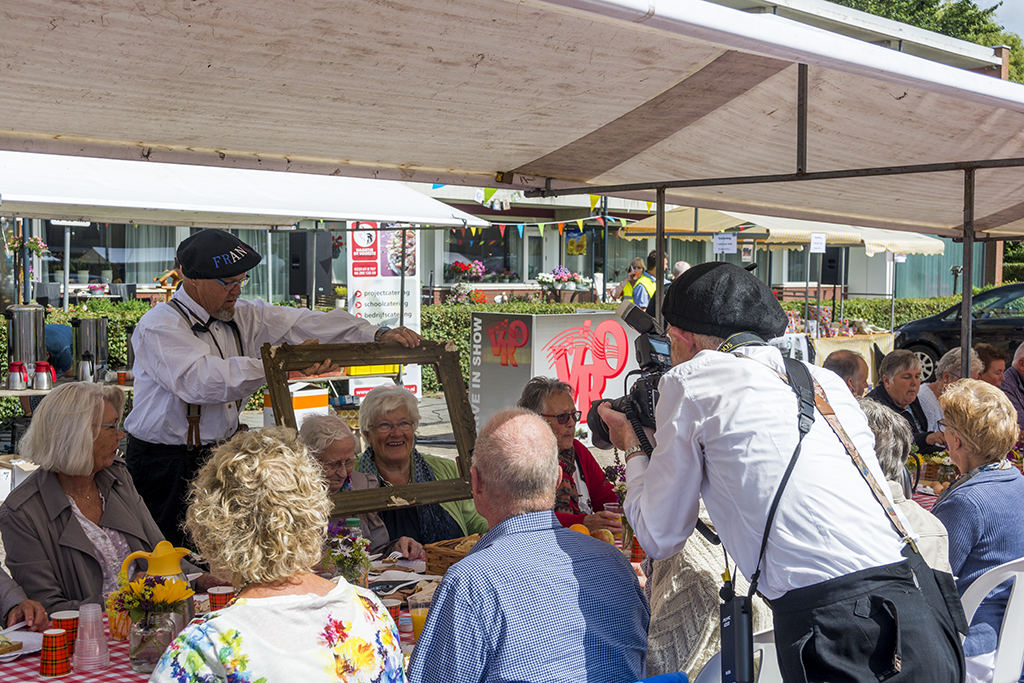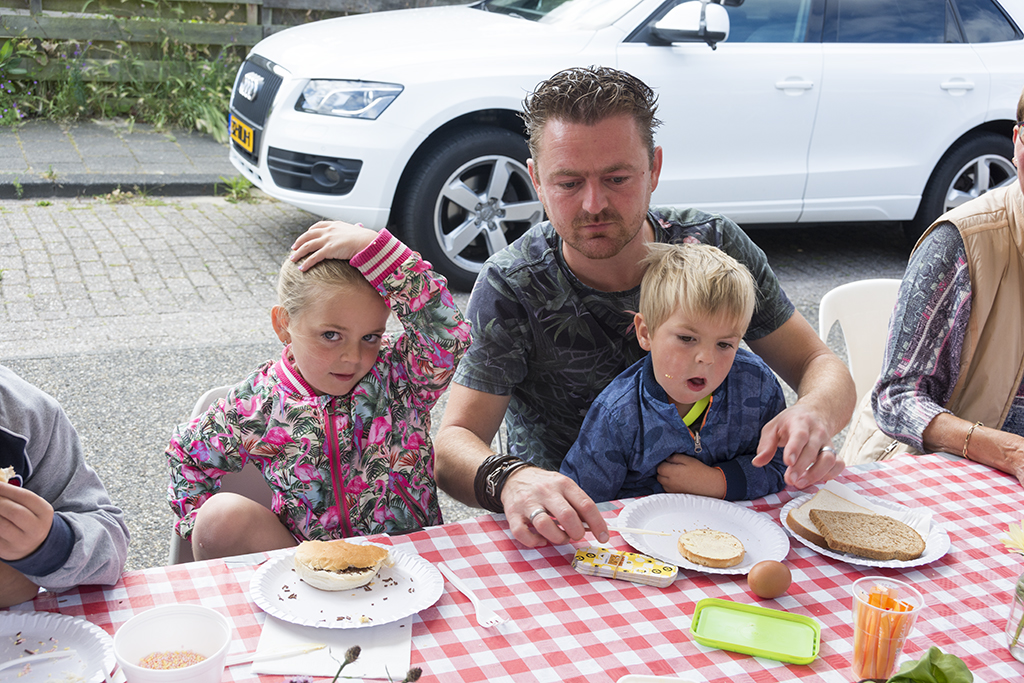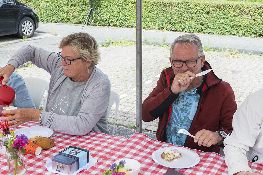 Afgelopen zondag was het dan zo ver. Na veel voorbereiding en een paar schietgebedjes, gezien de weersverwachting, werden zondagochtend om 06:30 uur 24 marktkramen in de Wilhelminastraat neergezet. Vervolgens kwam vanaf 8 uur menig vrijwilliger zich melden en werden de kramen gedekt met borden, bestek,  bekers, etenswaren etc. etc. En om de tafels op te vrolijken ook vele vaasjes met zomerbloemen, geplukt en beschikbaar gesteld door de Zorgboerderij. Vele handen, mede door de leden van de Dorpsraad die ook nog kwamen helpen, maakten dat om 10:45 uur alles klaar stond om de bezoekers van de brunch te ontvangen. Nog wel een kleine tegenslag met koffie en thee, doordat er een stop uit de meterkast sprong en dan kun je lang wachten tot dat het water warm is/wordt.
