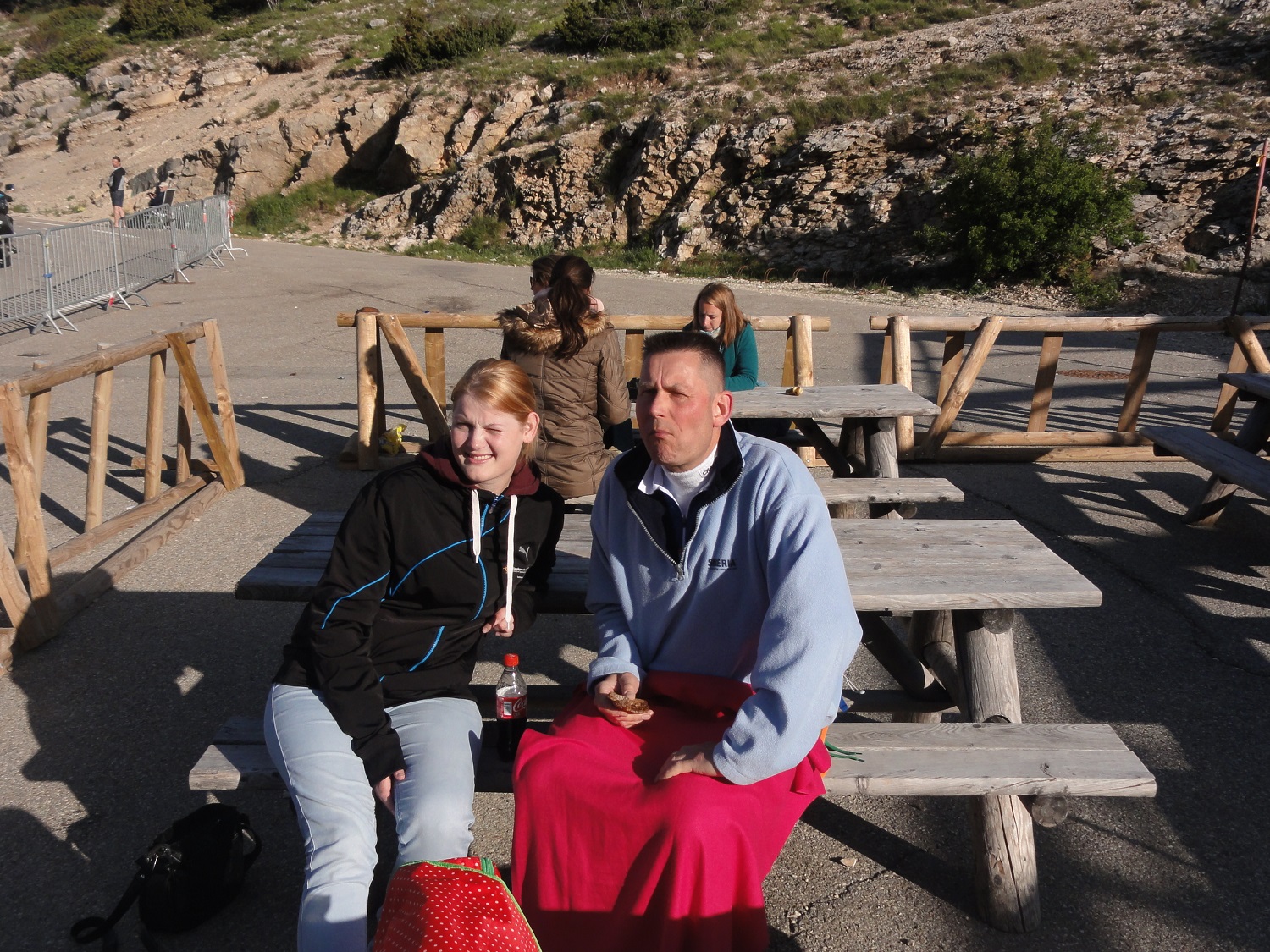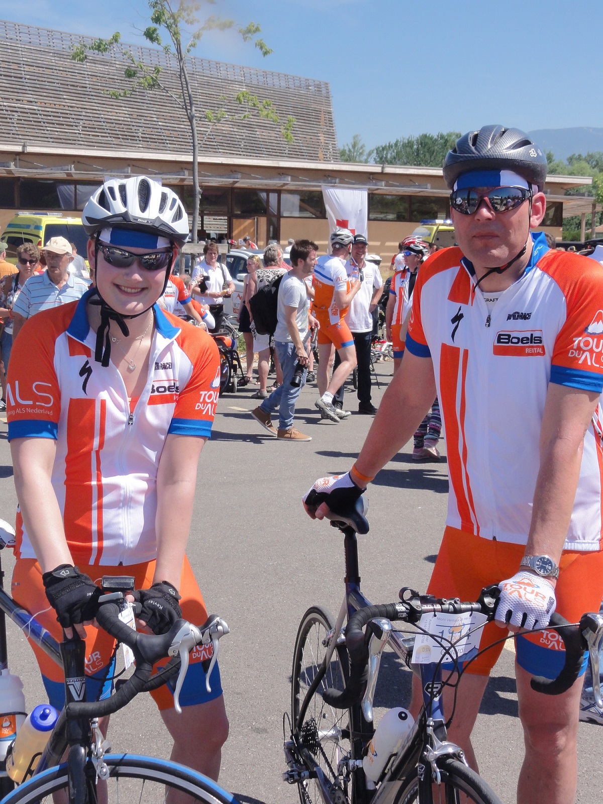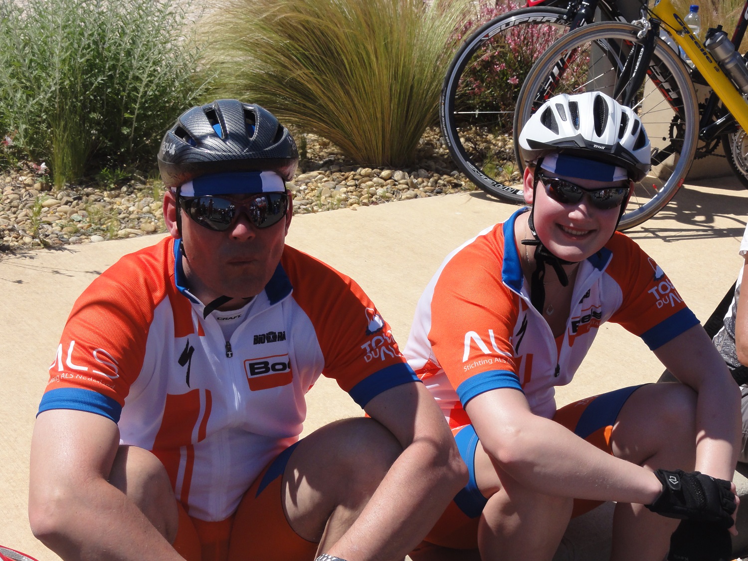 ’Gerard merkte al meteen dat het een zware dobber zou worden. Het wandelen had zijn tol geëist en de benen voelden als pap. Irene ging echter heel goed. Na een paar kilometer de berg op, fietste zij dan ook van Gerard weg en vooruit, want Gerard kon het tempo niet bijhouden. Hij moest zelfs regelmatig van de fiets, want de pedalen wilden gewoon niet rond. Wat we wel hebben gemerkt is het gegeven dat de ploeg MarGrieten&Mannen in 2013 een wereldprestatie heeft geleverd, door met de tandem omhoog te gaan. Wat is de weg stijl en wat kost het een moeite om vooruit te komen. Het was vandaag overigens bloedheet. Meerdere keren kwam het kwik boven de dertig graden. Irene was als eerste bij plateau Reynaert, maar moest bijna overgeven, zo beroerd voelde zij zich. Ze kon geen eten binnenhouden en ja, zonder benzine, geen arbeid. Door het zweten leek het wel of je een dagje naar het strand was geweest. Alles zout en hoesten bij diep inademen. Gerard was een stuk later op het plateau en gezien de tijd en onze conditie was het niet te doen om nog naar de top te rijden. Helaas dus niet helemaal het doel gehaald van onze missie. Alhoewel financieel gezien is het natuurlijk perfect gegaan. Vanavond op de bank met behoorlijk wat spierpijn in de benen en in de nek, want dat naar beneden racen is ook nog niet zo gemakkelijk. Groeten vanuit een zonnig zuid Frankrijk van team M&M en haar grootste supporter, Mirjam.’