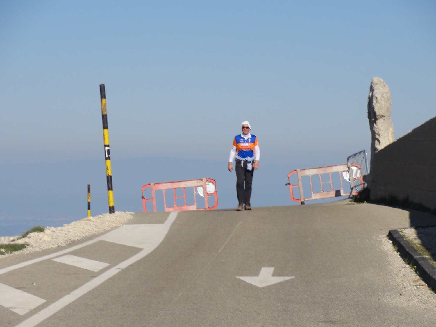 ’Vandaag was het dan zo ver. Om 5 uur in de ochtend van start vanuit Bedoin, voor de wandeling naar de top van de Mont Ventoux. Was vorig jaar Mirjam de enige supporter, dit jaar waren Mirjam en Irene er bij, maar ook twee verslaggevers van RTV-NH. Zij hebben het vertrek in beeld gebracht en was overdag al te zien in een item op RTV-NH. Dat merkten wij tenminste aan de reacties vanuit Nederland. Om 07.40 uur was ik op plateau Reynaert, wat zes kilometer onder de top ligt. Mirjam en Irene stonden al te wachten met brood en cola (lekker veel suiker voor de lichaamsarbeid). Het wandelen ging goed en om 9.15 uur was ik op de top en tjonge jonge: Ook daar waren de verslaggevers van RTV-NH aanwezig. Nadat we met een busje weer naar de start- en finishlocatie in Mazan waren gebracht, even uitgerust en vervolgens in fietskledij omgekleed. Om 12.30 uur ging de hele meute van start voor de laatste beklimming op de fiets. Via een omweg in verband met gesmolten wegdek toch naar de opgang, gezien vanuit Bedoin.’