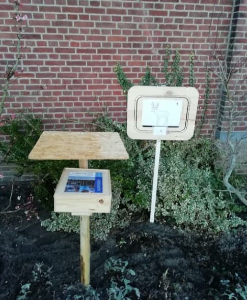 Mocht u de flyer kwijt zijn, bij de kerk, de start van de speurtocht, staat naast het bord met het 1e rebuswoord ook een kistje met formulieren. Dus daar kunt u eventueel een nieuw formulier wegpakken. Op de foto ziet u ook bord nr 1 en de overige 13 borden zijn identiek en ’s avonds zelfs verlicht.