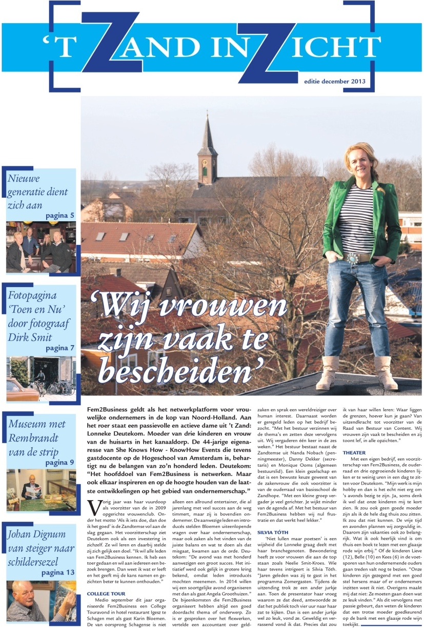 In de krant komen onder meer de volgende items aan bod: Lonneke Deutekom (voorzitter Fem2Business), familie Sprenkeling met de zorgboerderij, de dorpsraad over het dorpsplein, column van voorzitter Adriaan Jongejan, Frits van der Linden vertelt over zijn museum met werk van Hans G. Kresse, langeafstandloper Co Mulder, Johan Dignum (van steiger naar schildersezel), Timmerfabriek Doedens (bestaat in 2014 honderd jaar), Ron Jimmink over tafeltennisvereniging Doko en de genomineerden voor de verkiezing ondernemer van het jaar worden uitgelicht. Ook twee ondernemers met kinderen in het bedrijf staan in de krant. Dit jaar Schouten Elektrotechniek en café De Jonge Prins. Verder een fotopagina ‘Toen en Nu’ door Dirk Smit en een woordzoeker waarbij zes Zakenclubbonnen te winnen zijn. De uitgevers van ’t Zand inZicht danken Zakenclub ’t Zand en haar leden voor het vertrouwen en wensen iedereen een gezond, gelukkig en ondernemend 2014.