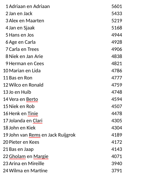 Ook was duidelijk te zien dat het klaverjassen zelf door de meesten nog niet verleerd was. Zeker niet door Adriaan en Adriaan. Er stond geen maat op dit tweetal. Dankzij een score van ruim boven de 2000 en 2 maal een 1700, werden zij onbedreigd winnaar van deze eerste drive. Jan en Jack bleven nog enigszins in de buurt en legden beslag op de 2e plaats. Het podium werd gecompleteerd door Alex en Maarten. De poedelprijs ging deze keer naar Wilma en Martine. Verder is het fenomeen pitprijs ook dit jaar weer door de organisatie in ere hersteld. Hoewel, de eerste pitprijs bleek niet aanwezig! Gelukkig wordt Jo hier niet warm of koud van en loste dit op strakke wijze op. Bewonderenswaardig dat hij in zijn eentje de avond aan elkaar wist te praten. Niet alleen het kaarten en de prijsuitreiking liepen uiteindelijk op rolletjes. Ook de verloting was Jo wel toevertrouwd. Met hulp van Marty die de prijzen naar de juiste winnaar bracht. Grootste winnaar was Tiny, die er met de boodschappentas vandoor ging. Rest ons verder nog een woord van dank uit te spreken richting Mireille en Rita voor het vakkundig regelen van de inschrijving.