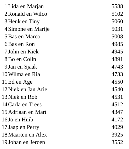 De einduitslag zelf, daar kunnen we kort over zijn. Lida en Marjan veegden deze avond met iedereen de vloer aan en werden met geruime voorsprong op de concurrentie de eerste winnaars van dit seizoen. Ronald en Wilco wisten na een sterke eindsprint uiteindelijk beslag te leggen op de 2e prijs. Het podium werd gecompleteerd door Henk en Tiny. De eerste boerenkool voor de poedelprijs ging naar Johan en Jeroen. Al met al een bijzonder geslaagde eerste avond.