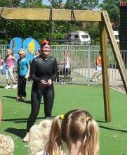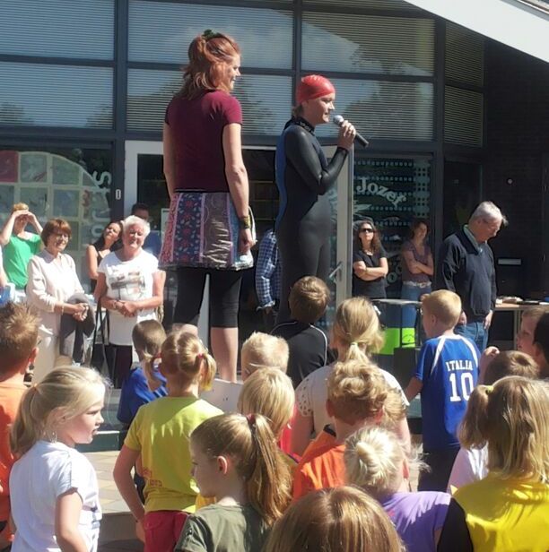 Met deze zwemtocht wordt geld ingezameld voor kinderen met een spierziekte, stichting spieren Debby Burger wateractie school (5)voor spieren.  Femm Bakker is een meisje van 2 jaar uit ’t  Zand die geboren is met een spierziekte, te weten myotone Dystrofie. Door haar vechtlust is ze in haar ontwikkeling al veel verder gekomen dan bij haar geboorte werd aangenomen. Deze vechtlust van haar zal Debby nodig hebben om met haar gezonde spieren de monsteroversteek Den Helder – Texel te gaan maken. Het resultaat van deze actie is dat de kinderen wel 300 ballonnen hebben gegooid, wat een sponsoring van € 150,00 bij elkaar is geworden, supergoed! Sponsoren zonder een waterballon te gooien mag natuurlijk ook: http://www.betough.nl/held/debby-burger-de-graaf/