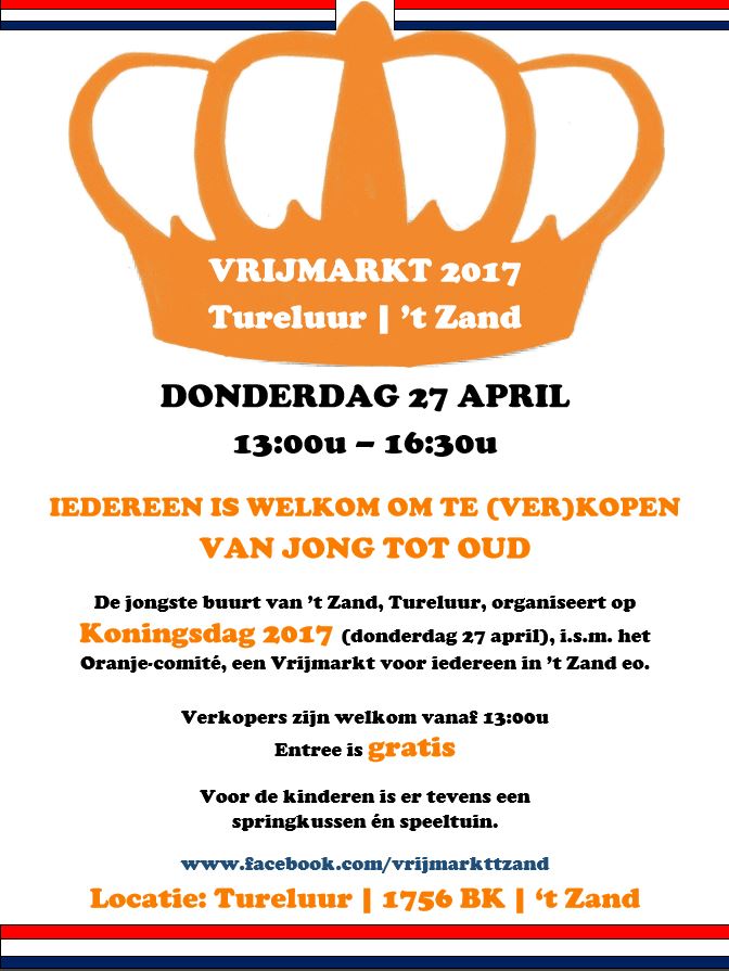 In de ochtend organiseert het Zandtemer Oranje-comité de welbekende feestspelletjes en vanaf 13:00u kunnen de verkopers richting de Tureluur om hun spulletjes uit te stallen en zijn de kopers dan welkom om lekker te struinen tussen de koopjes en een gezellige middag te hebben. Iedereen uit ’t Zand en omstreken is welkom om te komen kopen én verkopen. De entree is gratis en, zoals dat hoort bij een Vrijmarkt, regelt elke verkoper een eigen kleed/zeil om de koopwaar op uit te stallen (geen kofferbakken).