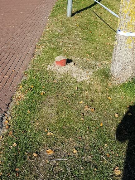 Beiden palen zijn afgelopen nacht, tijdens de kermis, moedwillig afgebroken. Dat dit expres is gedaan, is te zien aan de schoensporen in het zand. Al eerder, in de nacht van zaterdag op zondag 30 sept. is er ook al een kleine paal uit de grond gerukt en op straat gegooid. Terwijl in een eerder stadium een grote en een kleine paal zijn verdwenen…. ?!?