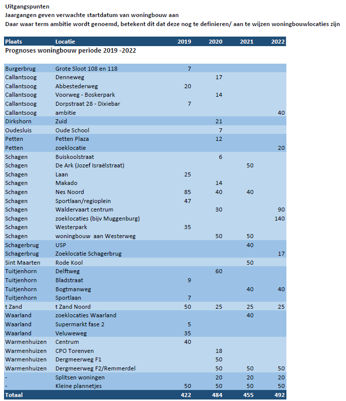 Er is een tekort aan woningen in de gemeente Schagen. Daarom wil de gemeente in de komende vier jaar graag minimaal 300 woningen per jaar realiseren. Deze worden verspreid over de hele gemeente gepland. Wethouder Beemsterboer heeft de lijst met projecten ter informatie aan de gemeenteraad verzonden. De lijst bevat ruim 400 woningen per jaar, omdat de gemeente de ervaring heeft dat om verschillende redenen, zoals bijvoorbeeld rechtsgang, een deel van de projecten uit zal stellen.