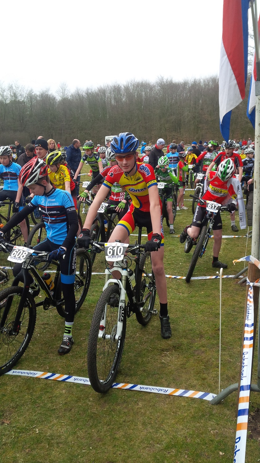 Deze tweede landelijke Jeugd Competitie in Berlicum is verreden op het prachtige bosrijke recreatiegebied ‘Engelenstede’. De MTB club The Whoopers hadden een mooi parcours uitgezet. Er waren diverse technische stukken, veel single track met genoeg plaatsen om in te halen, aangelegde heuveltjes en een zandbak.